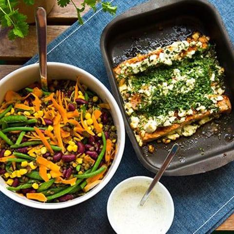 2. Sjud puylinserna i saltat vatten i 20 minuter. Flaga morötterna med en potatisskalare. Blanda linser och morotsflagor med sockerärtor, majs, sköljda kidneybönor och pumpafrön. Ringla över balsamvinäger, olivolja och smaka av med kryddor.