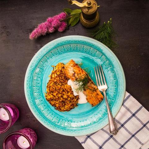 Tack vare att palsternackan inte kokas utan bara rårivs och steks ihop blir indexet lite lägre. Tillsammans med ost i plättarna blir det fantastiskt gott. Pepparrotscremen kan man göra med vilken sorts creme fraiche man vill, eller utesluta helt. Dock är pepparrot larvigt gott till lax. Välj pepparrot på tub eller riv färsk. Servera med den goda bönsalladen för extra protein och fibrer.