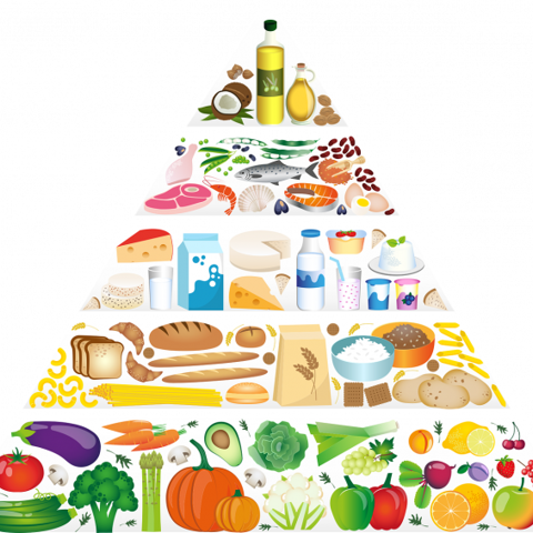 Matpyramiden - visar innehåll och ungefärlig fördelning i ett hälsosamt matmönster. Basen utgörs av grönsaker, baljväxter (ärter, bönor, linser), rotfrukter, lök, färska kryddor, frukt, bär, nötter, mandel, frön, grovt bröd och andra fiberrika spannmål samt pasta och ris. Basfettet är vegetabiliska oljor.