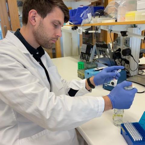 Filip Ottosson tar ut metaboliter ur prover med blodplasma. Studierna har visat att normalviktiga individer kan ha överviktsliknande förändringar i sin ämnesomsättning och ökad risk för typ 2-diabetes. Foto: Petra Olsson