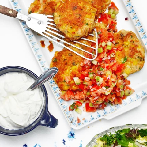 Lakto- vegetariskt recept med lite sting! Dessa ärtiga majsbiffar, gjorda på kikärtor, vita bönor, majs, persilja, sambal oelek, och ost är mycket smakrika och serveras med bulgur, sallad, yoghurt och tomatsalsa. Supergott!