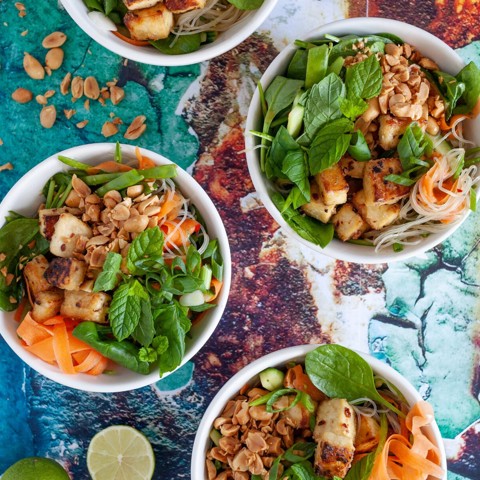 10. Lägg upp nudelsalladen i fyra djupa skålar. Toppa med krispig tofu, jordnötter och myntablad.