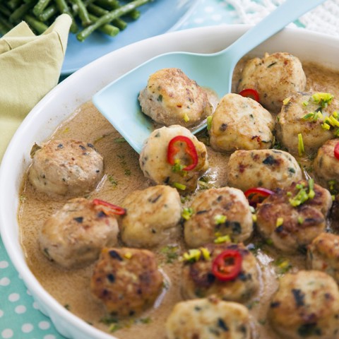 Härliga asiatiska kycklingbollar med lite sting och en sås gjord på kokosmjölk. Servera tillsammans med ris och ingefärsstekta sojabönor.