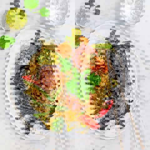 Läckert, lättlagat och hälsosamt! Kycklingfärsbiffar med riven ingefära och röd curry serveras här med en sallad på sjögräsnudlar och wokgrönsaker.