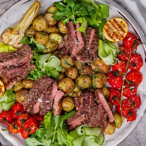 En imponerande och matig sallad till som passar nu när våren är här. Grillad entrecote samsas med ugnsstekta körsbärstomater och rostad potatis som smaksätts med en härlig dressing på färska örter, citron och vitlök.
