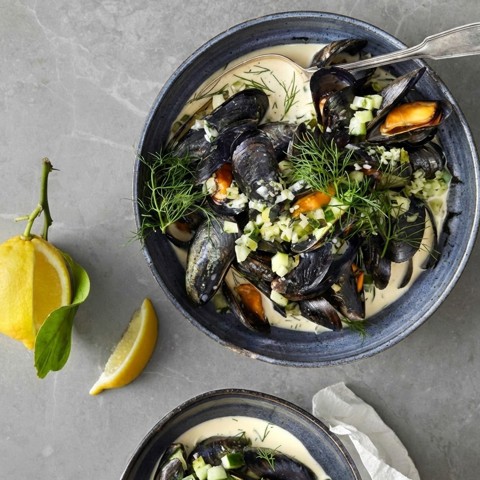 Blåmusslor med gurka, selleri och dill