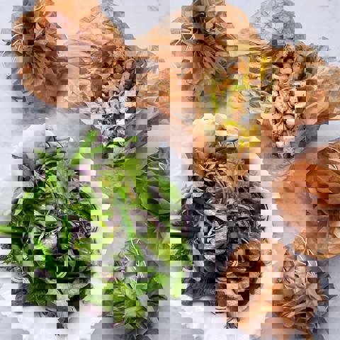 Ett recept på goda vegetariska knyten med fetaost och blomkål. I knytet finns även godsaker som potatis, kikärtor och rödlök. Knytet serveras med en fantastisk gräslöksdressing och primörsallad. För receptet behövs 4 st folieark/smörpapper samt snöre. Tips, koka gärna potatisen en dag i förväg.