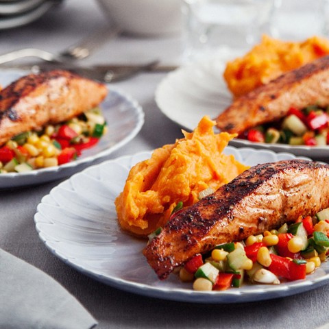 7. Servera den stekta laxen med sötpotatismos och salsa.
