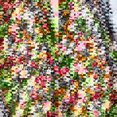 Toppa couscoussalladen med de frästa kikärtorna och granatäppelkärnor. Smula över fetaost och servera.