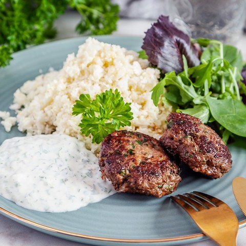 Byt ut det vita riset mot blomkålsris, det är både nyttigare och riktigt gott! Här serverar vi riset med härliga nötfärsbiffar och en kall örtdipp. Tips! välj yoghurt efter hur stor mängd fett du önskar till dippen.