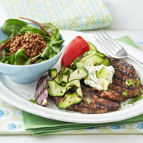 - Servera entrecote med grönsakerna, linser, sallad och tzatziki.