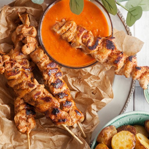 Grillade kycklingspett med en härlig bbq-sås. Servera med ugnsrostad potatis och lite fräsch sallad.