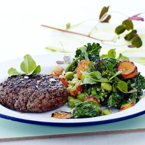 - Lägg upp biffarna med det småvarma gröna och ärtskott.