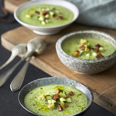 7. Häll upp den kylda soppan i skålar och ringla över några droppar olivolja. Lite nymalen svartpeppar på det och så krutonger och några gurkbitar. Servera direkt!