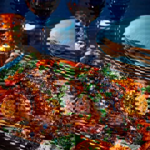 Helgrillad kyckling med vitlök och örter och rostade rotfrukter