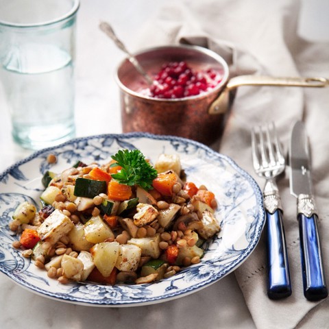 5. Höstpytt: Sila av linserna och spola dem under kallt vatten. Ta ut pytten ur ugnen och blanda i linserna.