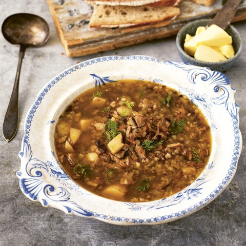 Recept på en värmande soppa som smakar höst och skog. Bovete och svamp passar väldigt bra ihop. Det rostade bovetet bidrar även med en härligt nötig smak.