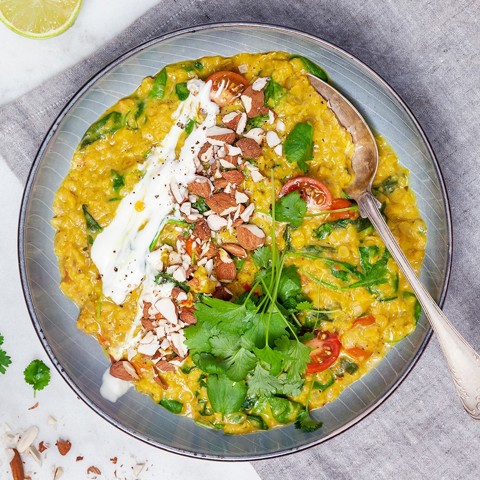 Daal, dal eller dhal är en indisk linsgryta full med smaker från bland annat ingefära, garam masala och chili. Grytan rundas av fint med krämig kokosmjölk och toppas här med hackad sötmandel.