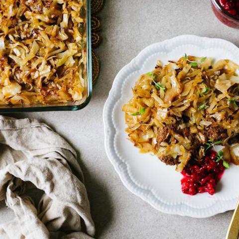 - Lägg hälften av kål/lökblandningen i en ugnsfast form, lägg på biffarna och sedan resten av kål/lökblandningen.