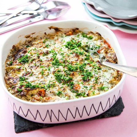 7. Bred oströran över fisken och sätt in i ugnen ca 15 minuter.