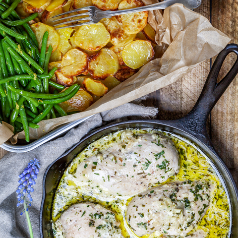 Härlig middag med kyckling i dragonsås, smörslungade haricots verts och rostad potatis. Tips! Tina kycklingen över natten i kylen om du köpt fryst.