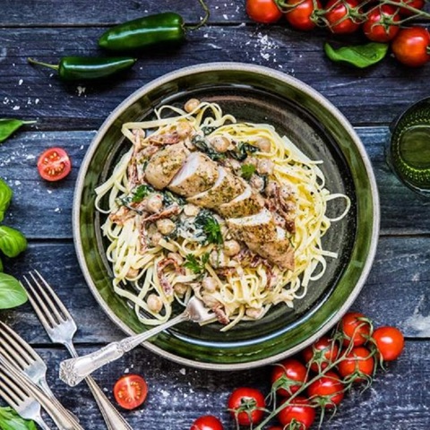 - Hacka löken och låt den mjukna i smör i stekpannan. När löken börjar bli genomskinlig, pressa i vitlök och stek ytterligare en minut. Ha ner strimlade, soltorkade tomater, sköljda kikärtor, grädde, rivet skal och saft från en citron samt basilikablad. Ha i mer citron om en syrligare smak önskas. Låt allt puttra ihop några minuter så grädden tjocknar. Smaka av med salt och peppar. Ha ner den stekta kycklingen och halverade oliver. Låt puttra ytterligare 1-2 minuter.