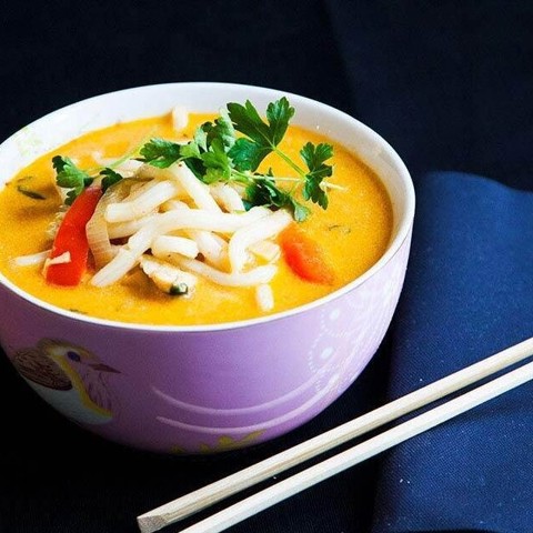 En snabblagad nudelsoppa med kyckling och gul curry. Börja med en mindre mängd curry och smaka av. Om du inte hittar gul currypasta kan du testa med röd eller grön currypasta.
