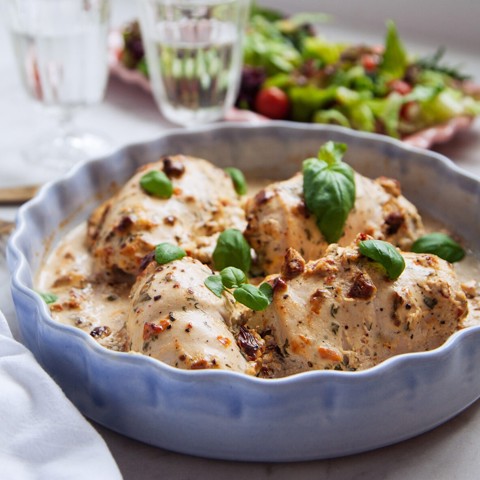 4. Finhacka de soltorkade tomaterna och blanda med creme fraiche, salt och peppar. Bred röran över kycklingen och sätt in i ugnen ca 20-30 min. Kontrollera att kycklingen är genomstekt.