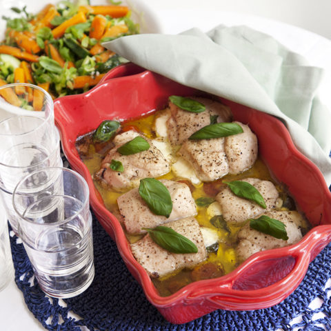 Klassikern kyckling med mozzarella får här sällskap av balsamvinäger, vitlök och körsbärstomater.