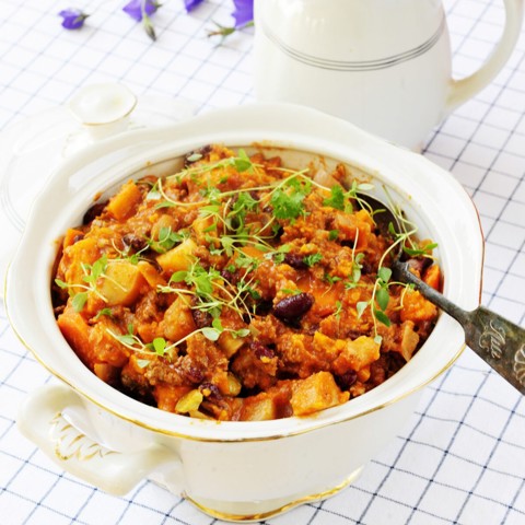 En lantlig ”allt-i-ett-gryta” fullproppad med nyttiga rotfrukter och bönor. Sötpotatis har trots sin söta smak lägre GI-värde jämfört med vanlig potatis.