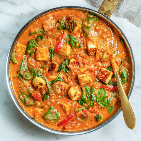 8. Servera palak paneer med ris och sallad vid sidan av.