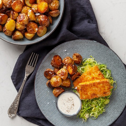 9. Servera den panerade tofun med rostad potatis, parmesankräm och brysselkålssallad.