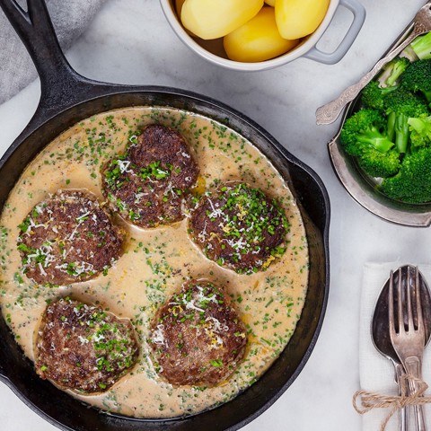 Klassiska biffar med parmesanost för extra smak. Serveras i en god gräslökssås tillsammans med kokt potatis och broccoli.