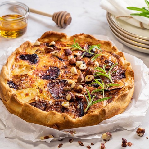 8. Ta ut pajen ur formen och lägg upp på ett fat. Ringla över över lite extra honung och dekorera med hasselnötter och rosmarinkvistar. Servera gärna med en sallad vid sidan av.
