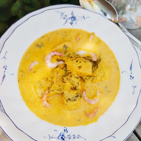 6. Tillsätt fiskbitarna och låt de sjuda i soppan i ca 4-5 min. Tillsätt räkor och servera meddetsamma.