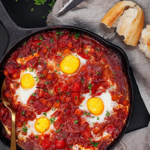 Shakshuka är lika gott till brunch som till middag, och enkelt att tillaga. Den härliga tomatbasen kryddas med harissa och toppas med ägg som pocheras i stekpannnan.