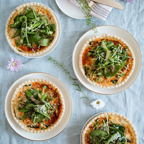 11. Skär bort den nedersta delen av ärtskotten. Blanda ärtskottsknopparna med spenat och sparrisknopparna och toppa de färdiga pajerna med. Riv över lite parmesan och citronskal. Klart att servera.