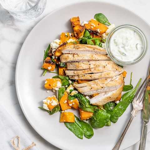 Stekt kyckling med rostad sötpotatis och tzatziki