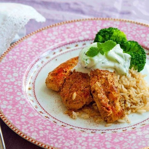 Tandoorikyckling med myntadipp och broccoli