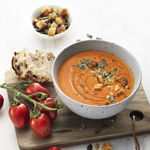 En superenkel och krämig soppa med en söt fin smak som hela familjen gillar. Pumpafrön och krutonger bidrar med härlig crunch. Middagen är klar på tio minuter!