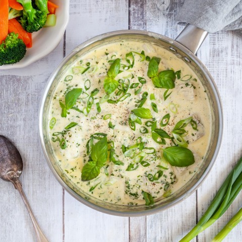 6. Smaka av såsen med salt och peppar. Lägg ner fisk och basilika i såsen och låt fisken sjuda i ca 5 min på låg värme.