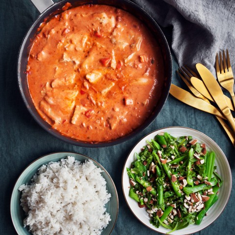 Vad sägs om torsk i en härligt mustig tomatsås med smaker från Marocko? Till torsken serveras en krispig mandel- och ärtsallad.