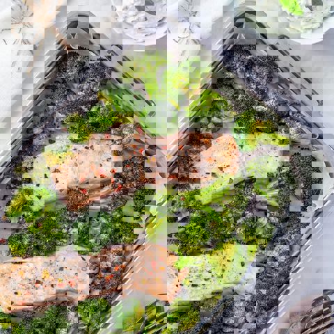Krydda laxen med salt, peppar och chiliflakes. Ta ut plåten med broccoli efter 5 min och lägg på laxen. Stek allt i mitten av ugnen i ca 12-15 min.