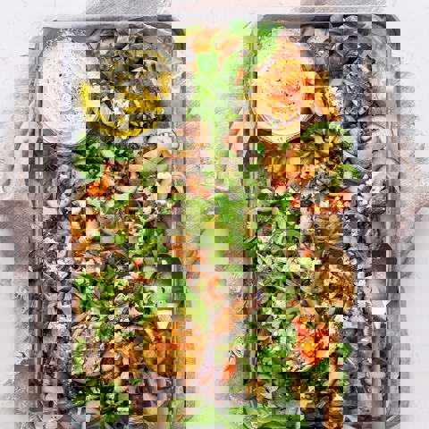 Lättlagad vegetarisk rätt där maten till stor del sköter sig själv i ugnen. De ugnsrostade grönsakerna toppas med linser och fetaost och serveras med en kall persiljesås.