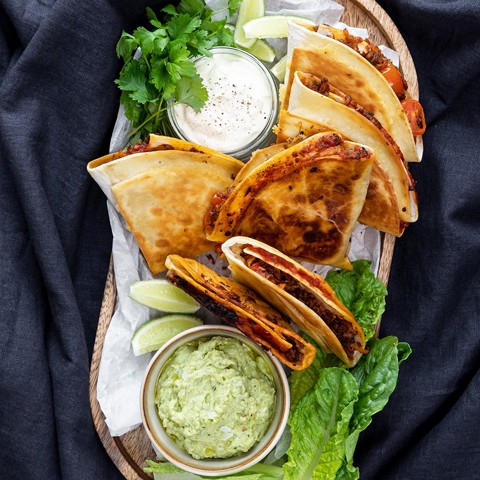 En variant av quesadillan som fått stor spridning på sociala medier. Fördela fyra olika fyllningar i fjärdedelar på ett tortillabröd, vik ihop och stek i en panna. Servera med guacamole, sallad och en klick crème fraiche!