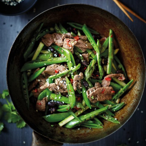 5. Tillsätt sparris, sockerärter, svarta bönor och sesamolja och sänk värmen.