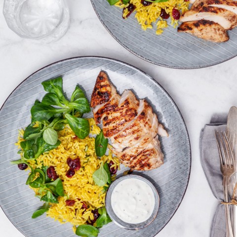 Vacker och okomplicerad rätt. Marinerad och stekt kyckling serveras här med ett smaksatt ris som toppas med torkade tranbär. Tips! Tina kycklingen i kylen över natten.